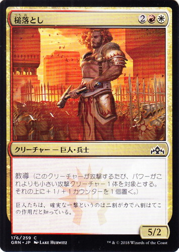 ![]() ![]() | GRN 176 槌落とし クリーチャー ラヴニカのギルド C 色:赤/白 サブタイプ:巨人・兵士 マナコスト:(2)(赤)(白) パワー:5 タフネス:2 透かしシンボル:ボロス 教導(このクリーチャーが攻撃するたび、パワーがこれよりも小さい攻撃クリーチャー1体を対象とする。それの上に+1/+1カウンターを1個置く。) 巨人たちは、確実な一撃というのはニ割が力で八割はてこの作用だと知っている。 illust:LAKE HURWITZ |