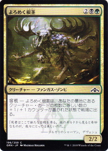 ![]() ![]() | GRN 196 よろめく根茎 クリーチャー ラヴニカのギルド C 色:黒/緑 サブタイプ:ファンガス・ゾンビ マナコスト:(2)(黒)(緑) パワー:2 タフネス:2 透かしシンボル:ゴルガリ 宿根―よろめく根茎は、あなたの墓地にあるクリーチャー・カードの枚数に等しい数の+1/+1カウンターが置かれた状態で戦場に出る。 「死者はここで新たな目的を得る。他のギルドから見ると奇妙なものが、我々にとっては美しいのだ。」 ――ゴルガリのシャーマン、デヴェシュ illust:MATHIAS KOLLROS |