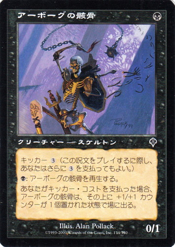 ![]() ![]() | INV 134 アーボーグの骸骨 クリーチャー インベイジョン C 色:黒 サブタイプ:スケルトン マナコスト:(黒) パワー:0 タフネス:1 キッカー(3)(この呪文をプレイするに際し、あなたはさらに(3)を支払ってもよい。) (黒):アーボーグの骸骨を再生する。 あなたがキッカー・コストを支払った場合、アーボーグの骸骨は、その上に+1/+1カウンターが1個置かれた状態で場に出る。 illust:Alan Pollack |