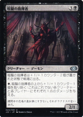 ![]() ![]() | J22 020 喧騒の指揮者 クリーチャー ジャンプスタート2022 U 色:黒 サブタイプ:デーモン マナコスト:(3)(黒) パワー:2 タフネス:1 喧騒の指揮者は+1/+1カウンター2個が置かれた状態で戦場に出る。 (黒), 喧騒の指揮者の上から+1/+1カウンター1個を取り除く:これはこれでない各クリーチャーと各プレイヤーにそれぞれ1点のダメージを与える。 拷問中の悲鳴の真似事にすぎない。それがラクドスの言い分だ。 illust:JASON A. ENGLE |