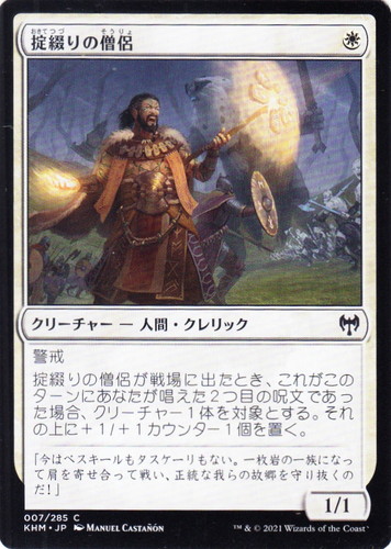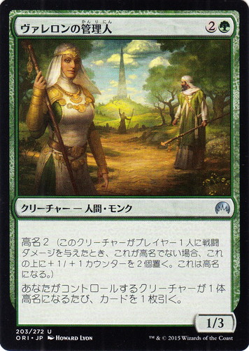 ![]() ![]() | ORI 203 ヴァレロンの管理人 クリーチャー マジック・オリジン U 色:緑 サブタイプ:人間・モンク マナコスト:(2)(緑) パワー:1 タフネス:3 [sk:高名]]2(このクリーチャーがプレイヤー1人に戦闘ダメージを与えたとき、これが高名でない場合、これの上に+1/+1カウンターを2個置く。これは高名になる。) あなたがコントロールするクリーチャーが1体高名になるたび、カードを1枚引く。 illust:HOWARD LYON |