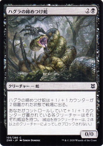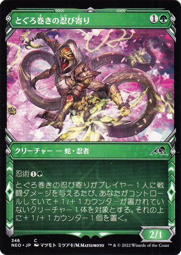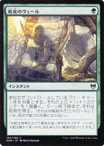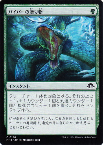 ![]() ![]() | MH3 0156 バイパーの贈り物 インスタント モダンホライゾン3 C 色:緑 マナコスト:(緑) クリーチャー1体を対象とする。それの上に+1/+1カウンター1個と到達カウンター1個と接死カウンター1個を置く。それをアンタップする。 蛇が毒を生き延びた者に大いなる力を授けると信じるオーランの魔術師は、毒蛇の牙に自らかかり耐え忍ぶこともいとわない。 illust:MADELINE BONI |