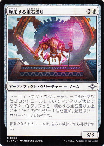 ![]() ![]() | LCI 0003 順応する宝石護り アーティファクト・クリーチャー イクサラン:失われし洞窟 C 色:白 サブタイプ:ノーム マナコスト:(3)(白) パワー:3 タフネス:3 アーティファクトやクリーチャーでありあなたがコントロールしていてアンタップ状態である2つをタップする:順応する宝石護りの上に+1/+1カウンター1個を置く。起動はソーサリーとしてのみ行う。 装置を任されたノームは、自らの設計ですら再設計する。 illust:ANTHONY DEVINE |