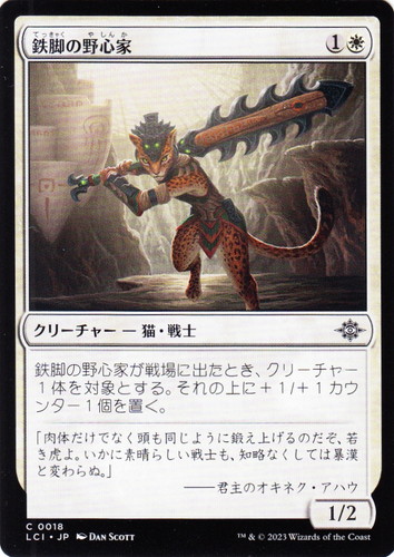 ![]() ![]() | LCI 0018 鉄脚の野心家 クリーチャー イクサラン:失われし洞窟 C 色:白 サブタイプ:猫・戦士 マナコスト:(1)(白) パワー:1 タフネス:2 鉄脚の野心家が戦場に出たとき、クリーチャー1体を対象とする。それの上に+1/+1カウンター1個を置く。 「肉体だけでなく頭も同じように鍛え上げるのだぞ、若き虎よ。いかに素晴らしい戦士も、知略なくしては暴漢と変わらぬ。」 ――君主のオキネク・アハウ illust:DAN SCOTT |