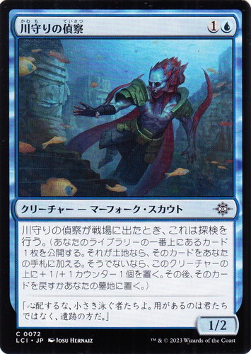 ![]() ![]() | LCI 0072 川守りの偵察 クリーチャー イクサラン:失われし洞窟 C 色:青 サブタイプ:マーフォーク・スカウト マナコスト:(1)(青) パワー:1 タフネス:2 川守りの偵察が戦場に出たとき、これは探検を行う。(あなたのライブラリーの一番上にあるカード1枚を公開する。それが土地なら、このカードをあなたの手札に加える。そうでないなら、このクリーチャーの上に+1/+1カウンター1個を置く。その後、そのカードを戻すかあなたの墓地に置く。) 「心配するな、小さき泳ぐ者たちよ。用があるのは君たちではなく、遺跡の方だ。」 illust:JOSU HERNAIZ |