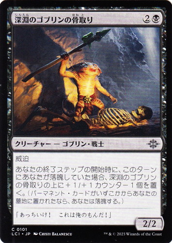 ![]() ![]() | LCI 0101 深淵のゴブリンの骨取り クリーチャー イクサラン:失われし洞窟 C 色:黒 サブタイプ:ゴブリン・戦士 マナコスト:(2)(黒) パワー:2 タフネス:2 威迫 あなたの終了ステップの開始時に、このターンにあなたが落魄していた場合、深淵のゴブリンの骨取りの上に+1/+1カウンター1個を置く。(パーマネント・カードがいずこかからあなたの墓地に置かれたなら、あなたは落魄する。) 「あっちいけ!これは俺のもんだ!」 illust:CRISTI BALANESCU |