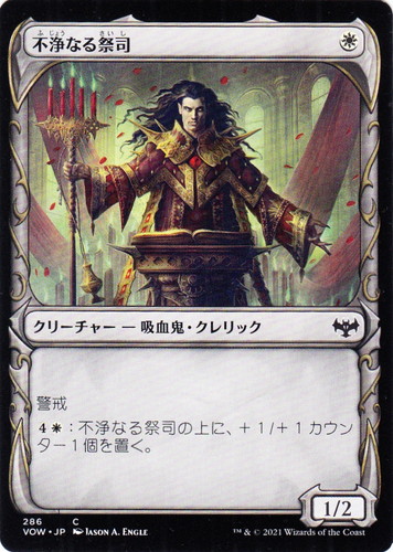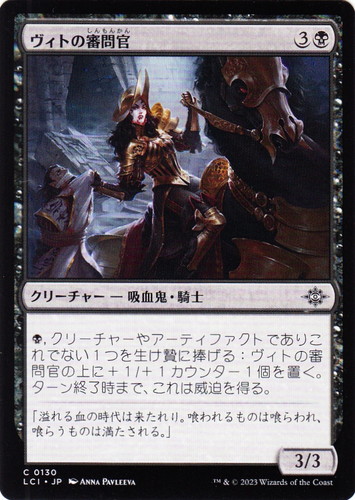![]() ![]() | LCI 0130 ヴィトの審問官 クリーチャー イクサラン:失われし洞窟 C 色:黒 サブタイプ:吸血鬼・騎士 マナコスト:(3)(黒) パワー:3 タフネス:3 (黒), クリーチャーやアーティファクトでありこれでない1つを生け贄に捧げる:ヴィトの審問官の上に+1/+1カウンター1個を置く。ターン終了時まで、これは威迫を得る。 「溢れる血の時代は来たれリ。喰われるものは喰らわれ、喰らうものは満たされる。」 illust:ANNA PAVLEEVA |