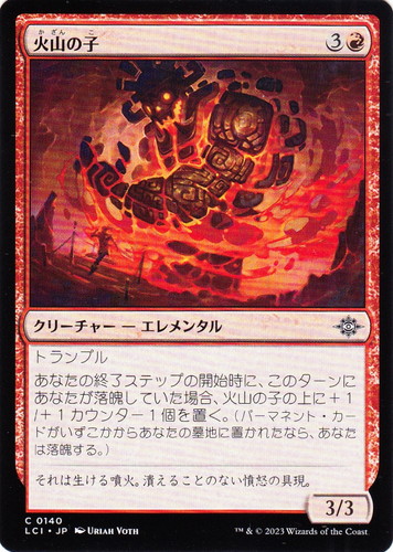 ![]() ![]() | LCI 0140 火山の子 クリーチャー イクサラン:失われし洞窟 C 色:赤 サブタイプ:エレメンタル マナコスト:(3)(赤) パワー:3 タフネス:3 トランプル あなたの終了ステップの開始時に、このターンにあなたが落魄していた場合、火山の子の上に+1/+1カウンター1個を置く。(パーマネント・カードがいずこかからあなたの墓地に置かれたなら、あなたは落魄する。) それは生ける噴火。潰えることのない憤怒の具現。 illust:URIAH VOTH |