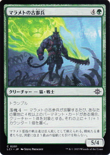 ![]() ![]() | LCI 0201 マラメトの古参兵 クリーチャー イクサラン:失われし洞窟 C 色:緑 サブタイプ:猫・戦士 マナコスト:(4)(緑) パワー:5 タフネス:4 トランプル 落魄4―マラメトの古参兵が攻撃するたび、あなたの墓地に4枚以上のパーマネント・カードがある場合、クリーチャー1体を対象とする。それの上に+1/+1カウンター1個を置く。 マラメト屈指の戦士達は巨人殺しとして鍛えられる。精鋭たる勇者たちは、洞窟に住まう最凶の猛獣にも引けを取らない。 illust:STEVE PRESCOTT |