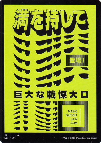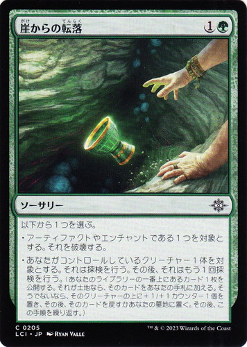 ![]() ![]() | LCI 0205 崖からの転落 ソーサリー イクサラン:失われし洞窟 C 色:緑 マナコスト:(1)(緑) 以下から1つを選ぶ。 ・アーティファクトやエンチャントである1つを対象とする。それを破壊する。 ・あなたがコントロールしているクリーチャー1体を対象とする。それは探検を行う。その後、それはもう1回探検を行う。(あなたのライブラリーの一番上にあるカード1枚を公開する。それが土地なら、そのカードをあなたの手札に加える。そうでないなら、そのクリーチャーの上に+1/+1カウンター1個を起き、その後、そのカードを戻すかあなたの墓地に置く。その後、この手順をくり返す。) illust:RYAN VALLE |