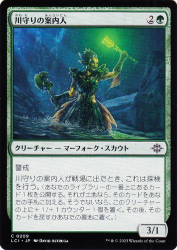 ![]() ![]() | LCI 0209 川守りの案内人 クリーチャー イクサラン:失われし洞窟 C 色:緑 サブタイプ:マーフォーク・スカウト マナコスト:(2)(緑) パワー:3 タフネス:1 警戒 川守りの案内人が戦場に出たとき、これは探検を行う。(あなたのライブラリーの一番上にあるカード1枚を公開する。それが土地なら、そのカードをあなたの手札に加える。そうでないなら、このクリーチャーの上に+1/+1カウンター1個を置く。その後、そのカードを戻すかあなたの墓地に置く。) illust:DAVID ASTRUGA |