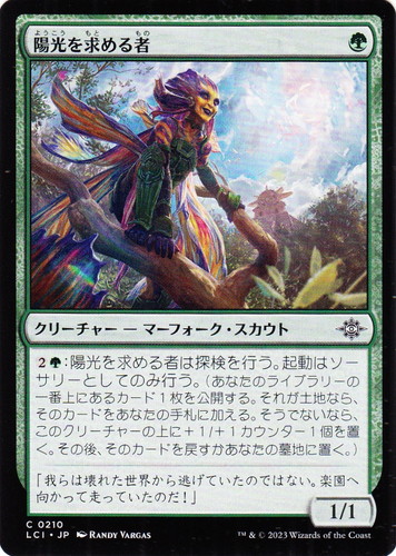 ![]() ![]() | LCI 0210 陽光を求める者 クリーチャー イクサラン:失われし洞窟 C 色:緑 サブタイプ:マーフォーク・スカウト マナコスト:(緑) パワー:1 タフネス:1 (2)(緑):陽光を求める者は探検を行う。起動はソーサリーとしてのみ行う。(あなたのライブラリーの一番上にあるカード1枚を公開する。それが土地なら、そのカードをあなたの手札に加える。そうでないなら、このクリーチャーの上に+1/+1カウンター1個を置く。その後、そのカードを戻すかあなたの墓地に置く。) 「我らは壊れた世界から逃げていたのではない。楽園へ向かって走っていたのだ!」 illust:RANDY VARGAS |