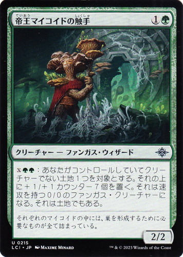 ![]() ![]() | LCI 0215 帝王マイコイドの触手 クリーチャー イクサラン:失われし洞窟 C 色:緑 サブタイプ:ファンガス・ウィザード マナコスト:(1)(緑) パワー:2 タフネス:2 (X)(緑)(緑):あなたがコントロールしていてクリーチャーでない土地1つを対象とする。それの上に+1/+1カウンター7個を置く。それは速攻を持つ0/0のファンガス・クリーチャーになる。それは土地でもある。 それぞれのマイコイドの中には、巣を形成するために必要なものが全て詰まっている。 illust:MAXIME MINARD |