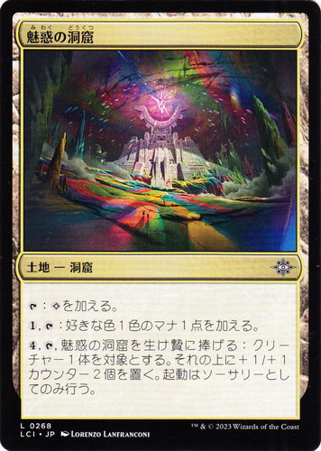 ![]() ![]() | LCI 0268 魅惑の洞窟 土地 イクサラン:失われし洞窟 C 色:無色 サブタイプ:洞窟 [T]:(無)を加える。 (1), [T]:好きな色1色のマナ1点を加える。 (4), [T], 魅惑の洞窟を生け贄に捧げる:クリーチャー1体を対象とする。それの上に+1/+1カウンター2個を置く。起動はソーサリーとしてのみ行う。 illust:LORENZO LANFRANCONI |