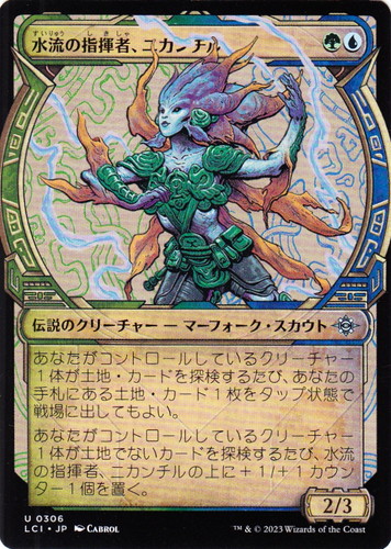 ![]() ![]() | LCI 0236 水流の指揮者、ニカンチル 伝説のクリーチャー イクサラン:失われし洞窟 U 色:緑/青 サブタイプ:マーフォーク・スカウト マナコスト:(緑)(青) パワー:2 タフネス:3 あなたがコントロールしているクリーチャー1体が土地・カードを探検するたび、あなたの手札にある土地・カード1枚をタップ状態で戦場に出してもよい。 あなたがコントロールしているクリーチャー1体が土地でないカードを探検するたび、水流の指揮者、ニカンチルの上に+1/+1カウンター1個を置く。 「訪ね方さえ知っていれば、この流れは何処へにも導いてくれる。」 illust:FARIBA KHAMSEH |