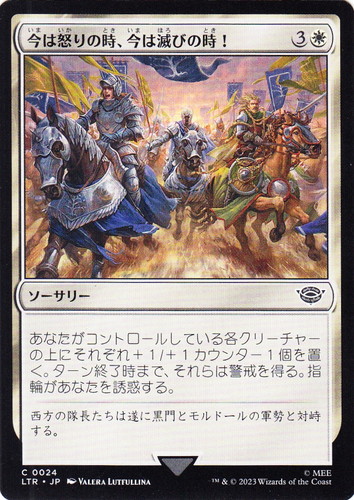 ![]() ![]() | LTR 0024 今は怒りの時、今は滅びの時! ソーサリー 指輪物語:中つ国の伝承 C 色:白 マナコスト:(3)(白) あなたがコントロールしている各クリーチャーの上にそれぞれ+1/+1カウンター1個を置く。ターン終了時まで、それらは警戒を得る。指輪があなたを誘惑する。 西方の隊長たちは遂に黒門とモルドールの軍勢と対峙する。 illust:VALERA LUTFULLINA 出典:指輪物語 |