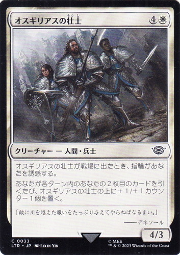 ![]() ![]() | LTR 0033 オスギリアスの荘士 クリーチャー 指輪物語:中つ国の伝承 C 色:白 サブタイプ:人間・兵士 マナコスト:(4)(白) パワー:4 タフネス:3 オスギリアスの荘士が戦場に出たとき、指輪があなたを誘惑する。 あなたが各ターン内のあなたの2枚目のカードを引くたび、オスギリアスの荘士の上に+1/+1カウンター1個を置く。 「敵に川を越えた報いをたっぷり与えてやらねばなるまい。」 ――デネソール illust:LIXIN YIN 出典:指輪物語 |