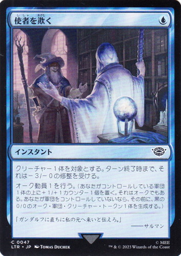 ![]() ![]() | LTR 0047 使者を欺く インスタント 指輪物語:中つ国の伝承 C 色:青 マナコスト:(青) クリーチャー1体を対象とする。ターン終了時まで、それは-3/-0の修整を受ける。 オーク動員1を行う。(あなたがコントロールしている軍団1体の上に+1/+1カウンター1個を置く。それはオークでもある。あなたが軍団をコントロールしていないなら、その前に、黒のオーク・軍団・クリーチャー・トークン1体を生成する。) 「ガンダルフに直ちに私の元に来いと伝えろ。」 ――サルマン illust:TOMAS DUCHEK 出典:指輪物語 |