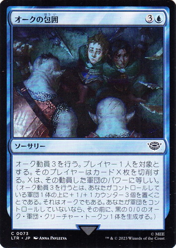 ![]() ![]() | LTR 0073 オークの包囲 ソーサリー 指輪物語:中つ国の伝承 C 色:青 マナコスト:(3)(青) オーク動員3を行う。プレイヤー1人を対象とする。そのプレイヤーはカードX枚を切削する。Xは、その動員した軍団のパワーに等しい。(オーク動員3を行うとは、あなたがコントロールしている軍団1体の上に+1/+1カウンター3個を置くことである。それはオークでもある。あなたが軍団をコントロールしていないなら、その前に、黒のオーク・軍団・クリーチャー・トークン1体を生成する。) illust:ANNA PAVLEEVA 出典:指輪物語 |
