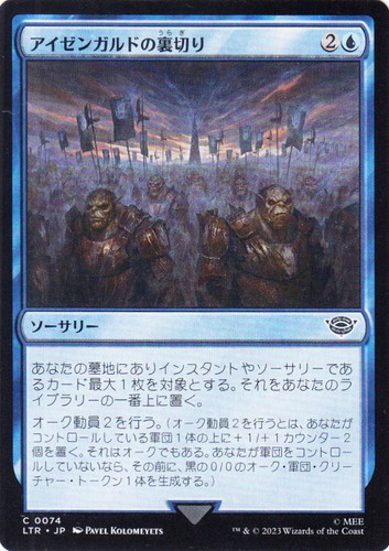 ![]() ![]() | LTR 0074 アイゼンガルドの裏切り ソーサリー 指輪物語:中つ国の伝承 C 色:青 マナコスト:(2)(青) あなたの墓地にありインスタントやソーサリーであるカード最大1枚を対象とする。それをあなたのライブラリーの一番上に置く。 オーク動員2を行う。(オーク動員2を行うとは、あなたがコントロールしている軍団1体の上に+1/+1カウンター2個を置く。それはオークでもある。あなたが軍団をコントロールしていないなら、その前に、黒の0/0のオーク・軍団・クリーチャー・トークン1体を生成する。) illust:PAVEL KOLOMEYETS 出典:指輪物語 |