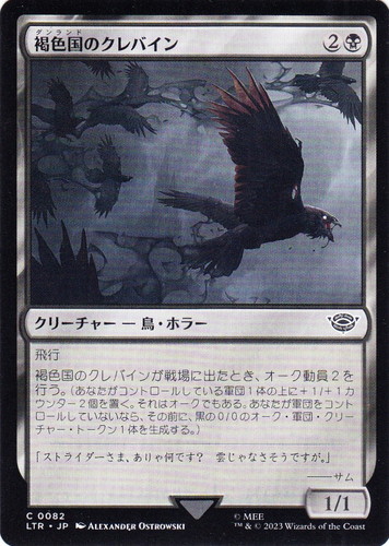 ![]() ![]() | LTR 0082 褐色国のクレバイン クリーチャー 指輪物語:中つ国の伝承 C 色:黒 サブタイプ:鳥・ホラー マナコスト:(2)(黒) パワー:1 タフネス:1 飛行 褐色国のクレバインが戦場に出たとき、オーク動員2を行う。(あなたがコントロールしている軍団1体の上に+1/+1カウンター2個を置く。それはオークでもある。あなたが軍団をコントロールしていないなら、その前に、黒の0/0のオーク・軍団・クリーチャー・トークン1体を生成する。) 「ストライダーさま、ありゃ何です?雲じゃなさそうですが。」 ――サム illust:ALEXANDER OSTROWSKI 出典:指輪物語 |