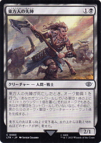 ![]() ![]() | LTR 0083 東方人の先陣 クリーチャー 指輪物語:中つ国の伝承 C 色:黒 サブタイプ:人間・戦士 マナコスト:(1)(黒) パワー:2 タフネス:1 東方人の先陣が死亡したとき、オーク動員1を行う。(あなたがコントロールしている軍団1体の上に+1/+1カウンター1個を置く。それはオークでもある。あなたが軍団をコントロールしていないなら、その前に、黒の0/0のオーク・軍団・クリーチャー・トークン1体を生成する。) 東方人の兵は真っ向より突き進み、丘の上からは数え切れぬほどのオークが押し寄せた。 illust:JAVIER CHARRO 出典:指輪物語 |