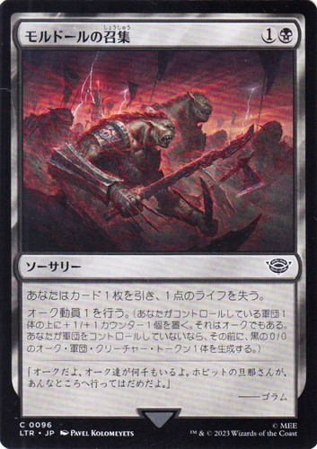 ![]() ![]() | LTR 0096 モルドールの召集 ソーサリー 指輪物語:中つ国の伝承 C 色:黒 マナコスト:(1)(黒) あなたはカード1枚を引き、1点のライフを失う。 オーク動員1を行う。(あなたがコントロールしている軍団1体の上に+1/+1カウンター1個を置く。それはオークでもある。あなたが軍団をコントロールしていないなら、その前に、黒の0/0のオーク・軍団・クリーチャー・トークン1体を生成する。) 「オークだよ、オーク達が何千もいるよ。ホビットの旦那さんが、あんなところへ行ってはだめだよ。」 ――ゴラム illust:PAVEL KOLOMEYETS 出典:指輪物語 |