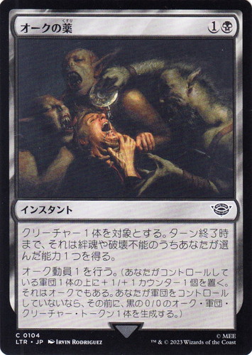 ![]() ![]() | LTR 0104 オークの薬 インスタント 指輪物語:中つ国の伝承 C 色:黒 マナコスト:(1)(黒) クリーチャー1体を対象とする。ターン終了時まで、それは絆魂や破壊不能のうちあなたが選んだ能力1つを得る。 オーク動員1を行う。(あなたがコントロールしている軍団1体の上に+1/+1カウンター1個を置く。それはオークでもある。あなたが軍団をコントロールしていないなら、その前に、黒の0/0のオーク・軍団・クリーチャー・トークン1体を生成する。) illust:IRVIN RODRIGUEZ 出典:指輪物語 |