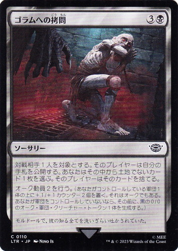 ![]() ![]() | LTR 0110 ゴラムへの拷問 ソーサリー 指輪物語:中つ国の伝承 C 色:黒 マナコスト:(3)(黒) 対戦相手1人を対象とする。そのプレイヤーは自分の手札を公開する。あなたはその中から土地でないカード1枚を選ぶ。そのプレイヤーはそのカードを捨てる。 オーク動員2を行う。(あなたがコントロールしている軍団1体の上に+1/+1カウンター2個を置く。それはオークでもある。あなたが軍団をコントロールしていないなら、その前に、黒の0/0のオーク・軍団・クリーチャー・トークン1体を生成する。) モルドールで、彼の知る全てを洗いざらい吐かされていた。 illust:NINO IS 出典:指輪物語 |