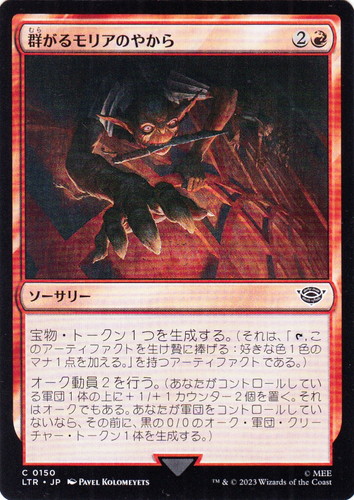 ![]() ![]() | LTR 0150 群がるモリアのやから ソーサリー 指輪物語:中つ国の伝承 C 色:赤 マナコスト:(2)(赤) 宝物・トークン1つを生成する。(それは、「[T], このアーティファクトを生け贄に捧げる:好きな色1色のマナ1点を加える。」を持つアーティファクトである。 オーク動員2を行う。(あなたがコントロールしている軍団1体の上に+1/+1カウンター2個を置く。それはオークでもある。あなたが軍団をコントロールしていないなら、その前に、黒の0/0のオーク・軍団・クリーチャー・トークン1体を生成する。) illust:PAVEL KOLOMEYETS 出典:指輪物語 |