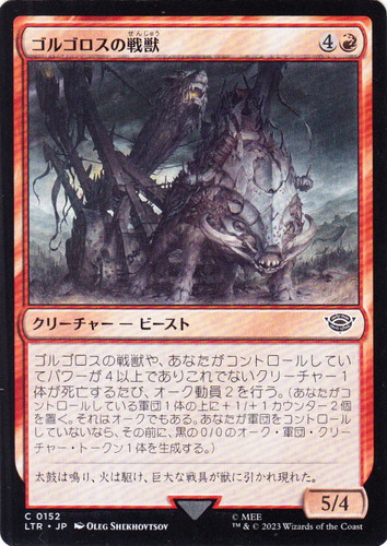 ![]() ![]() | LTR 0152 ゴルゴロスの戦獣 クリーチャー 指輪物語:中つ国の伝承 C 色:赤 サブタイプ:ビースト マナコスト:(4)(赤) パワー:5 タフネス:4 ゴルゴロスの戦獣や、あなたがコントロールしていてパワーが4以上でありこれでないクリーチャー1体が死亡するたび、オーク動員2を行う。(あなたがコントロールしている軍団1体の上に+1/+1カウンター2個を置く。それはオークでもある。あなたが軍団をコントロールしていないなら、その前に、黒の0/0のオーク・軍団・クリーチャー・トークン1体を生成する。) 太鼓は鳴り、火は駆け、巨大な戦具が獣に引かれ現れた。 illust:OLEG SHEKHOVTSOV 出典:指輪物語 |
