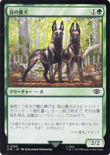![]() ![]() | LTR 0180 茸の番犬 クリーチャー 指輪物語:中つ国の伝承 C 色:緑 サブタイプ:犬 マナコスト:(1)(緑) パワー:2 タフネス:2 食物1つを生け贄に捧げる:茸の番犬の上に+1/+1カウンター1個を置く。ターン終了時まで、それは警戒を得る。起動はソーサリーとしてのみ行う。 「お前たちは手出ししないよ。俺がそう言わない限りな。おいで、グリップ!きば!おすわり!」 ――農夫、マゴット illust:ALEXANDER OSTROWSKI 出典:指輪物語 |