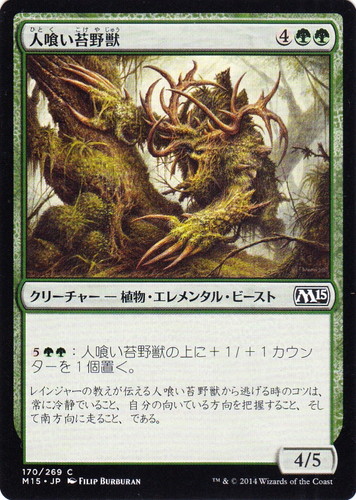 ![]() ![]() | M15 170 人喰い苔野獣 クリーチャー 基本セット2015 C 色:緑 サブタイプ:植物・エレメンタル・ビースト マナコスト:(4)(緑)(緑) パワー:4 タフネス:5 (5)(緑)(緑):人喰い苔野獣の上に+1/+1カウンターを1個置く。 レインジャーの教えが伝える人喰い苔野獣から逃げる時のコツは、常に冷静でいること、自分の向いている方向を把握すること、そして南方向に走ること、である。 illust:FILIP BURBURAN |