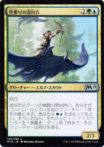 ![]() ![]() | M19 224 空乗りの巡回兵 クリーチャー 基本セット2019 U 色:緑/青 サブタイプ:エルフ・スカウト マナコスト:(2)(緑)(青) パワー:2 タフネス:3 飛行 あなたの戦闘の開始時に、あなたがコントロールしている他のクリーチャー1体を対象とする。あなたは(緑)(青)を支払ってもよい。そうしたなら、それの上に+1/+1カウンター1個を置き、ターン終了時まで、そのクリーチャーは飛行を得る。 illust:MITCHELL MALLOY |