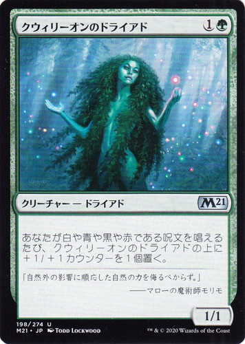 ![]() ![]() | M21 198 クウィリーオンのドライアド クリーチャー 基本セット2021 U 色:緑 サブタイプ:ドライアド マナコスト:(1)(緑) パワー:1 タフネス:1 あなたが白や黒や赤である呪文を唱えるたび、クウィリーオンのドライアドの上に+1/+1カウンターを1個置く。 「自然外の影響に順応した自然の力を侮るべからず。」 ――マローの魔術師モリモ illust:TODD LOCKWOOD |