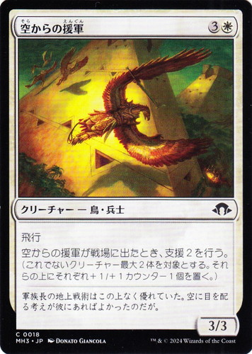 ![]() ![]() | MH3 0018 空からの援軍 クリーチャー モダンホライゾン3 C 色:白 サブタイプ:鳥・兵士 マナコスト:(3)(白) パワー:3 タフネス:3 飛行 空からの援軍が戦場に出たとき、支援2を行う。これでないクリーチャー最大2体を対象とする。それらの上にそれぞれ+1/+1カウンター1個を置く。 軍族長の地上戦術はこの上なく優れていた。空に目を配る考えが彼にあればよかったのだが。 illust:DONATO GIANCOLA |