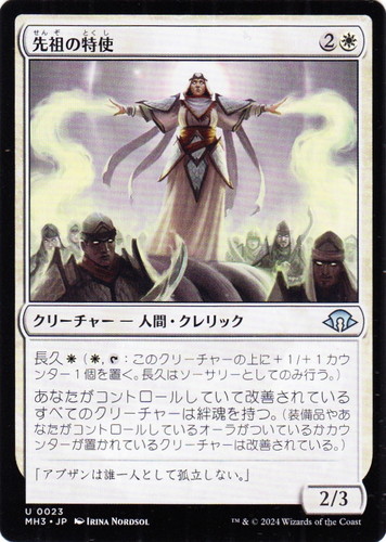 ![]() ![]() | MH3 0023 先祖の特使 クリーチャー モダンホライゾン3 U 色:白 サブタイプ:人間・クレリック マナコスト:(2)(白) パワー:2 タフネス:3 長久(白)((白), [T]:このクリーチャーの上に+1/+1カウンター1個を置く。長久はソーサリーとしてのみ行う。) あなたがコントロールしていて改善されているすべてのクリーチャーは絆魂を持つ。(装備品やあなたがコントロールしているオーラがついているかカウンターが置かれているクリーチャーは改善されている。) 「アブザンは誰一人として孤立しない。」 illust:IRINA NORDSOL |