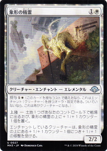 ![]() ![]() | MH3 0027 象形の精霊 クリーチャー・エンチャント モダンホライゾン3 U 色:白 サブタイプ:エレメンタル マナコスト:(1)(白) パワー:2 タフネス:2 授与(1)(白)(このカードを授与コストで唱えたなら、これはエンチャント(クリーチャー)を持つオーラ・呪文である。ついていないなら、これは再びクリーチャーになる。) 上陸―土地1つがあなたのコントロール下で戦場に出るたび、象形の精霊の上に+1/+1カウンター1個を置く。 エンチャントしているクリーチャーは、象形の精霊の上にある+1/+1カウンター1個につき+1/+1の修整を受ける。 illust:DOMENICO CAVA |