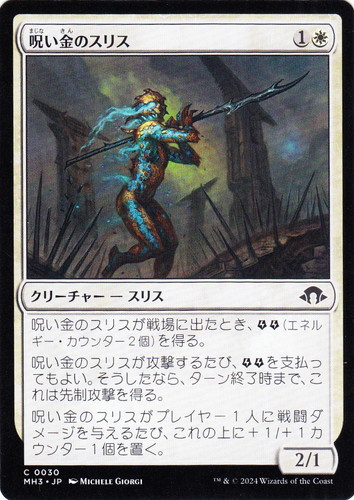 ![]() ![]() | MH3 0030 呪い金のスリス クリーチャー モダンホライゾン3 C 色:白 サブタイプ:スリス マナコスト:(1)(白) パワー:2 タフネス:1 呪い金のスリスが戦場に出たとき、[E][E](エネルギー・カウンター2個)を得る。 呪い金のスリスが攻撃するたび、[E][E]を支払ってもよい。そうしたなら、ターン終了時まで、これは先制攻撃を得る。 呪い金のスリスがプレイヤー1人に戦闘ダメージを与えるたび、これの上に+1/+1カウンター1個を置く。 illust:MICHELE GIORGI |
