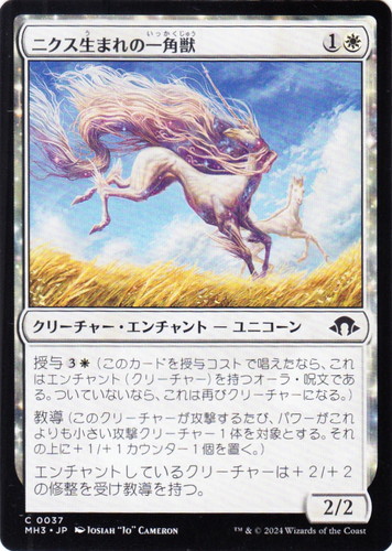 ![]() ![]() | MH3 0037 ニクス生まれの一角獣 クリーチャー・エンチャント モダンホライゾン3 C 色:白 サブタイプ:ユニコーン マナコスト:(1)(白) パワー:2 タフネス:2 授与(3)(白)(このカードを授与コストで唱えたなら、これはエンチャント(クリーチャー)を持つオーラ・呪文である。ついていないなら、これは再びクリーチャーになる。) 教導(このクリーチャーが攻撃するたび、パワーがこれよりも小さい攻撃クリーチャー1体を対象とする。それの上に+1/+1カウンター1個を置く。) エンチャントしているクリーチャーは+2/+2の修整を受け教導を持つ。 illust:JOSIAH “JO” CAMERON |