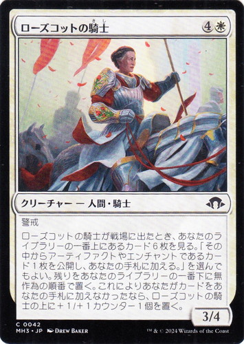 ![]() ![]() | MH3 0042 ローズコットの騎士 クリーチャー モダンホライゾン3 C 色:白 サブタイプ:人間・騎士 マナコスト:(4)(白) パワー:3 タフネス:4 警戒 ローズコットの騎士が戦場に出たとき、あなたのライブラリーの一番上にあるカード6枚を見る。「その中からアーティファクトやエンチャントであるカード1枚を公開し、あなたの手札に加える。」を選んでもよい。残りをあなたのライブラリーの一番下に無作為の順番で置く。これによりあなたがカードをあなたの手札に加えなかったなら、ローズコットの騎士の上に+1/+1カウンター1個を置く。 illust:DREW BAKER |
