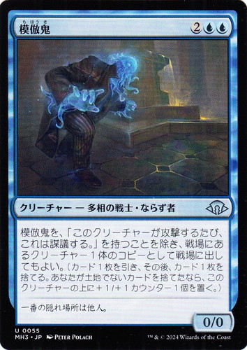 ![]() ![]() | MH3 0055 模倣鬼 クリーチャー モダンホライゾン3 U 色:青 サブタイプ:多相の戦士・ならず者 マナコスト:(2)(青)(青) パワー:0 タフネス:0 模倣鬼を、「このクリーチャーが攻撃するたび、これは謀議する。」を持つことを除き、戦場にあるクリーチャー1体のコピーとして戦場に出してもよい。(カード1枚を引き、その後、カード1枚を捨てる。あなたが土地でないカードを捨てたなら、このクリーチャーの上に+1/+1カウンター1個を置く。) 一番の隠れ場所は他人。 illust:PETER POLACH |