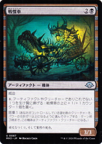![]() ![]() | MH3 0087 戦慄車 アーティファクト モダンホライゾン3 U 色:黒 サブタイプ:機体 マナコスト:(2)(黒) パワー:3 タフネス:3 威迫 (1), アーティファクトやクリーチャーでありこれでない1つを生け贄に捧げる:戦慄車の上に+1/+1カウンター1個を置く。 搭乗1(あなたがコントロールしている望む数のクリーチャーを、パワーの合計が1以上になるように選んでタップする:ターン終了時まで、この機体はアーティファクト・クリーチャーになる。) 頑丈なつくり、そして驚愕の屍力。 illust:ROCKEY CHEN |