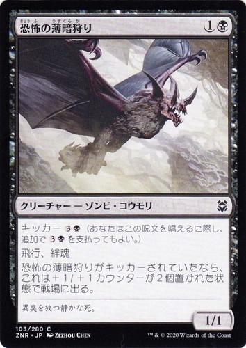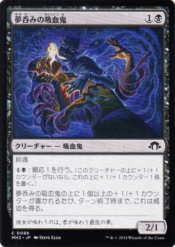 ![]() ![]() | MH3 0088 夢呑みの吸血鬼 クリーチャー モダンホライゾン3 C 色:黒 サブタイプ:吸血鬼 マナコスト:(1)(黒) パワー:2 タフネス:1 絆魂 (1)(黒):順応1を行う。(このクリーチャーの上に+1/+1カウンターがないなら、これの上に+1/+1カウンター1個を置く。) 夢呑みの吸血鬼の上に1個以上の+1/+1カウンターが置かれるたび、ターン終了時まで、これは威迫を得る。 彼女が味わうのは、君が味わう最後の夢。 illust:STEVE ELLIS |