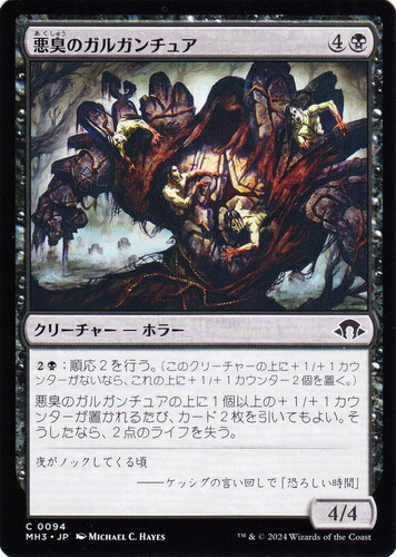 ![]() ![]() | MH3 0094 悪臭のガルガンチュア クリーチャー モダンホライゾン3 C 色:黒 サブタイプ:ホラー マナコスト:(4)(黒) パワー:4 タフネス:4 (2)(黒):順応4を行う。(このクリーチャーの上に+1/+1カウンターがないなら、これの上に+1/+1カウンター2個を置く。) 悪臭のガルガンチュアの上に1個以上の+1/+1カウンターが置かれるたび、カード2枚を引いてもよい。そうしたなら、2点のライフを失う。 夜がノックしてくる頃 ――ケッシグの言い回しで「恐ろしい時間」 illust:MICHAEL C. HAYES |
