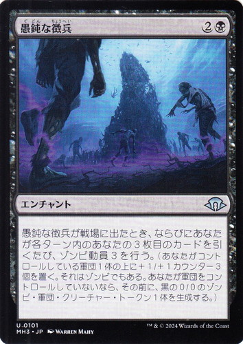 ![]() ![]() | MH3 0101 愚鈍な徴兵 エンチャント モダンホライゾン3 U 色:黒 マナコスト:(2)(黒) 愚鈍な徴兵が戦場に出たとき、ならびにあなたが各ターンのあなたの3枚目のカードを引くたび、ゾンビ動員3を行う。(あなたがコントロールしている軍団1体の上に+1/+1カウンター3個を置く。それはゾンビでもある。あなたが軍団をコントロールしていないなら、その前に黒の0/0のゾンビ・軍団・クリーチャー・トークン1体を生成する。) illust:WARREN MAHY |