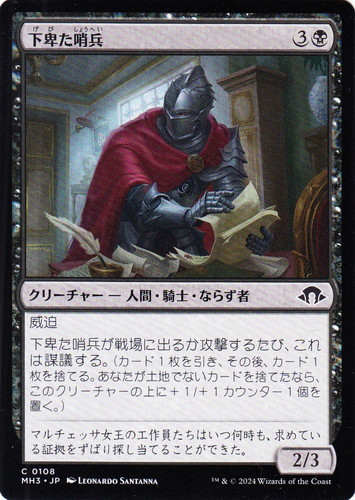 ![]() ![]() | MH3 0108 下卑た哨兵 クリーチャー モダンホライゾン3 C 色:黒 サブタイプ:人間・騎士・ならず者 マナコスト:(3)(黒) パワー:2 タフネス:3 威迫 下卑た哨兵が戦場に出るか攻撃するたび、これは謀議する。(カード1枚を引き、その後、カード1枚を捨てる。あなたが土地でないカードを捨てたなら、このクリーチャーの上に+1/+1カウンター1個を置く。) マルチェッサ女王の工作員たちはいつ何時も、求めている証拠をずばり探し当てることができた。 illust:LEONARDO SANTANNA |