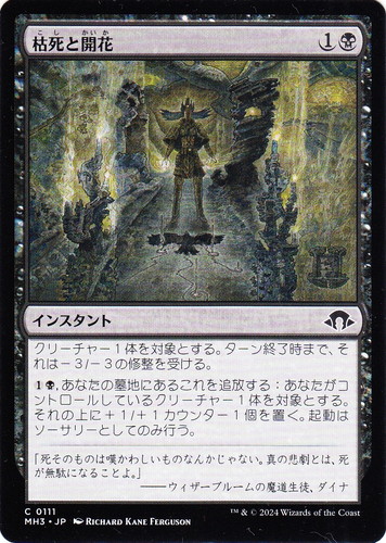 ![]() ![]() | MH3 0111 枯死と開花 インスタント モダンホライゾン3 C 色:黒 マナコスト:(1)(黒) クリーチャー1体を対象とする。ターン終了時まで、それは-3/-3の修整を受ける。 (1)(黒), あなたの墓地にあるこれを追放する:あなたがコントロールしているクリーチャー1体を対象とする。それの上に+1/+1カウンター1個を置く。起動はソーサリーとしてのみ行う。 「死そのものは嘆かわしいものなんかじゃない。真の悲劇とは、死が無駄になることよ。」 ――ウィザーブルームの魔道生徒、ダイナ illust:RICHARD KANE FERGUSON |