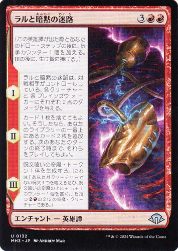![]() ![]() | MH3 0132 ラルと暗黙の迷路 エンチャント モダンホライゾン3 U 色:赤 サブタイプ:英雄譚 マナコスト:(3)(赤)(赤) (この英雄譚が出た際とあなたのドロー・ステップの後に、伝承カウンター1個を加える。IIIの後に、生け贄に捧げる。) [I]ラルと暗黙の迷路は、対戦相手がコントロールしている、各クリーチャーと各プレインズウォーカーにそれぞれ2点のダメージを与える。 [II]カード1枚を捨ててもよい。そうしたなら、あなたのライブラリーの一番上にあるカード2枚を追放する。次のあなたのターンの終了時まで、それらをプレイしてもよい。 [III]呪文喰いの奇魔・トークン1体を生成する。(これは「あなたがクリーチャーでない呪文1つを唱えるたび、呪文喰いの奇魔の上に+1/+1カウンター1個を置く。」を持つ(2)(赤)の2/2の奇魔・クリーチャーである。) illust:ANDREW MAR |
