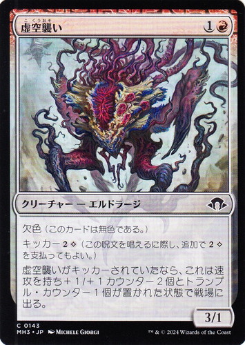 ![]() ![]() | MH3 0143 虚空襲い クリーチャー モダンホライゾン3 C 色:赤 サブタイプ:エルドラージ・ドローン マナコスト:(1)(赤) パワー:3 タフネス:1 欠色(このカードは無色である。) キッカー(2)(無)(この呪文を唱えるに際し、追加で(2)(無)を支払ってもよい。) 虚空襲いがキッカーされていたなら、これは速攻を持ち+1/+1カウンター2個とトランプル・カウンター1個が置かれた状態で戦場に出る。 illust:MICHELE GIORGI |